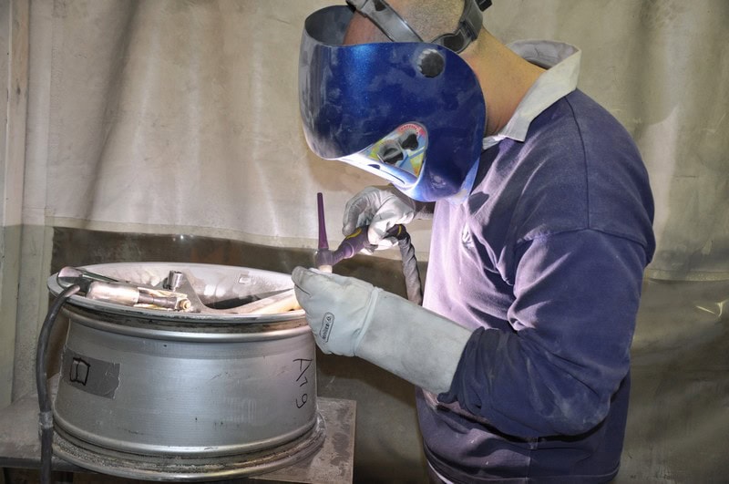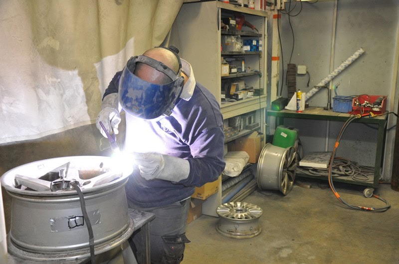 Les bords de jantes alu endommagés sont d'abord remis en ligne sur nos dévoileuses, on y ajoute de la matière aluminium sous gaz rares.